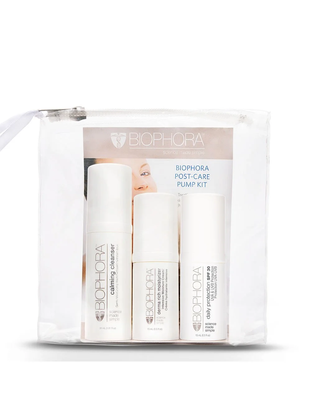Biophora post-procedure skincare kit with four white bottles and a brochure in a clear plastic pouch.